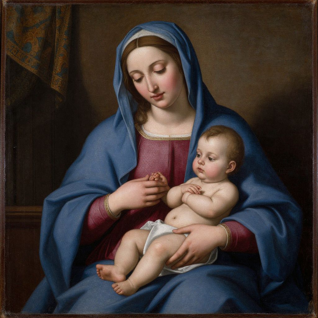 Photograph-like digital painting of a serene Madonna cradling baby Jesus, both with fair skin, blue cloak, maroon dress, baby in white