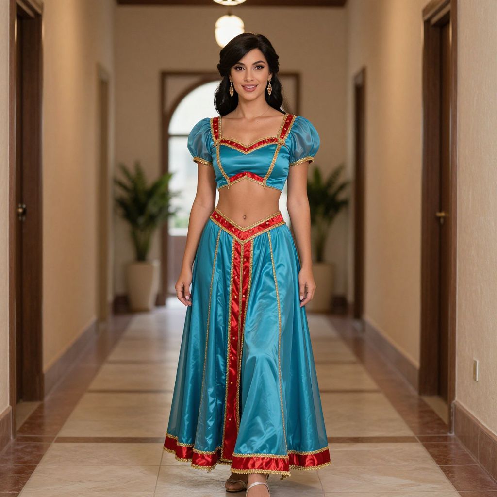 Jasmine Dress Aladdin, a woman in a blue and red dress standing in a hallway