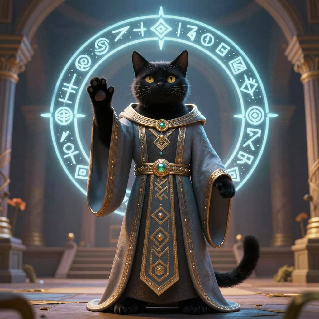 Telepathy A black cat wearing a medieval bard outfit, posing in an arena, in cinematic style by Brian Froud, Alan Lee. Volumetric lighting highlights embroidered patterns and feathers, captured from a low angle, super detailed and vivid.
