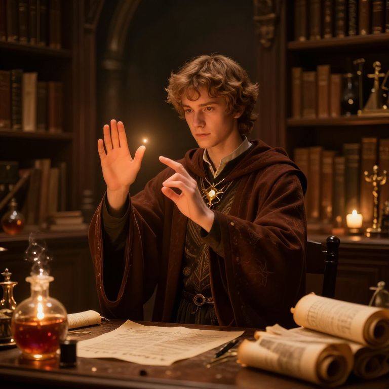 Sorcerer art featuring a young spellcaster practicing incantations in a mystical library, enchanted scrolls and potions glowing softly, warm lighting and intricate details conveying a sense of wonder and power.