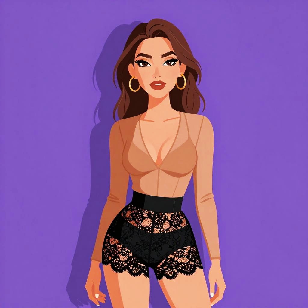 Digital illustration of a confident young woman with medium skin tone and long dark brown hair. She wears a sleeveless leopard print halter neck crop top paired with high-waist black faux leather pants. Accessories include large gold hoop earrings, gold-tone bangles, and a small black shoulder bag with a gold chain strap. The background is solid purple, highlighting the woman's edgy and fashionable look.