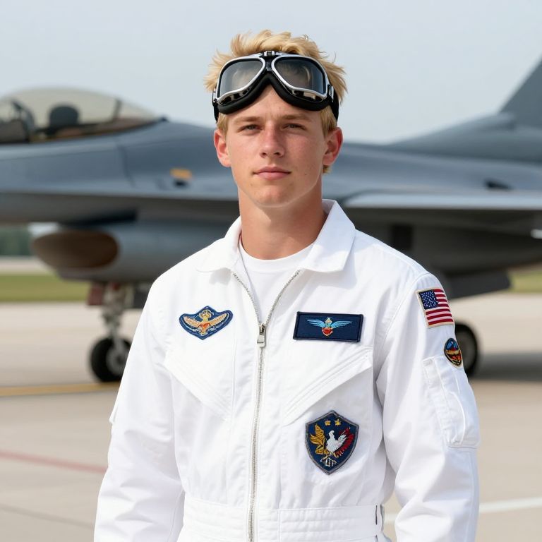 Photograph of a Caucasian man with short brown hair, wearing a blue flight suit and black headphones, standing in front of a white and black jet with "JIEFES" visible on the side. He has a serious expression and a silver ID badge hangs from his neck. The jet is parked on a sunny tarmac with a clear blue sky in the background.