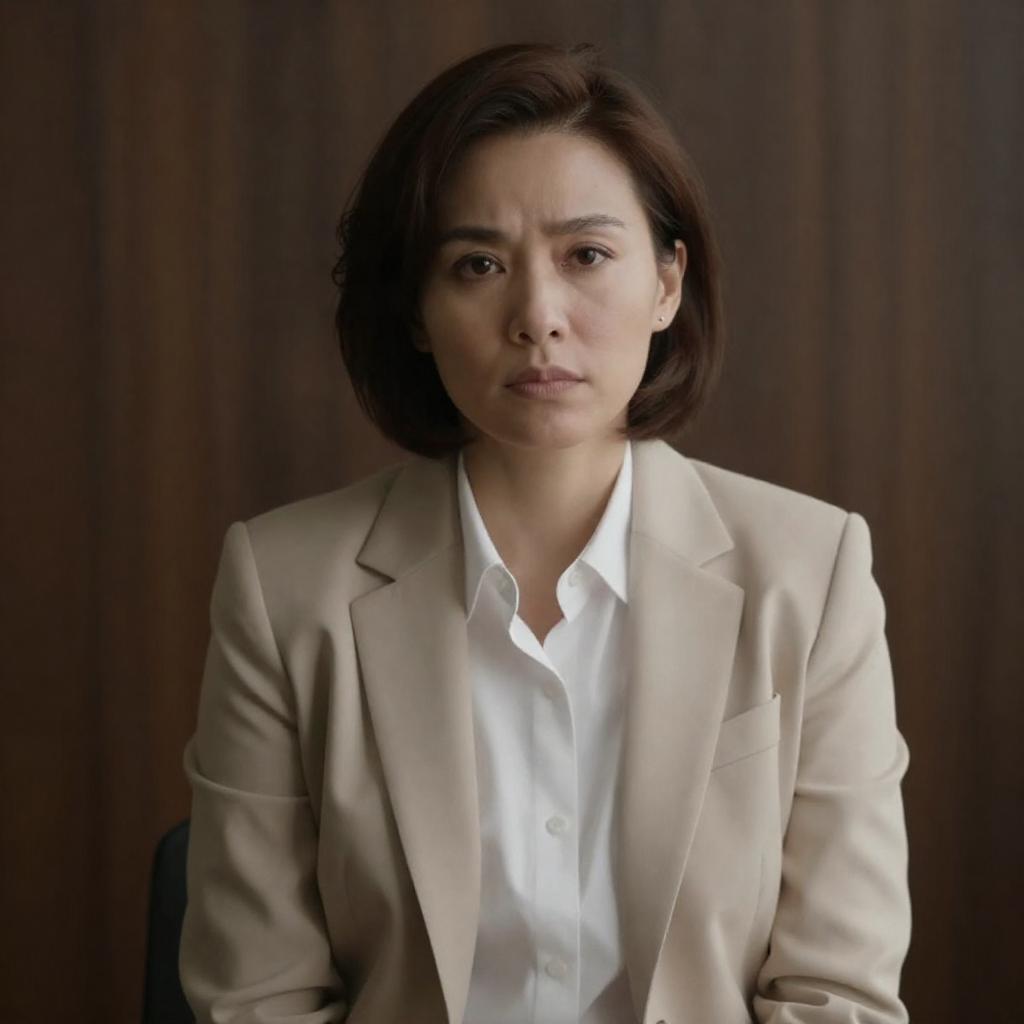 Photograph of a fair-skinned woman with dark brown hair in a neat bun, wearing a dark gray blazer and a blue patterned scarf. She has red lipstick and a serious expression, with her right hand gently holding the scarf. The blurred background features warm yellow and brown tones, suggesting an indoor setting.