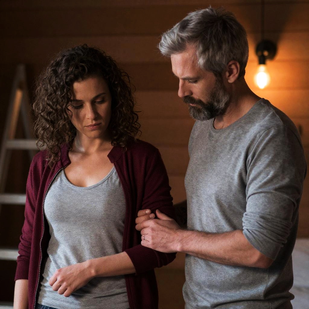 Photograph of a middle-aged couple in a modern hallway. Man with dark hair, light brown jacket, gently holds woman's face with left hand. Woman has red hair, light gray jacket, smiles widely. Man smiles softly, looking at woman. Both in profile. Bright, evenly lit hallway in background.