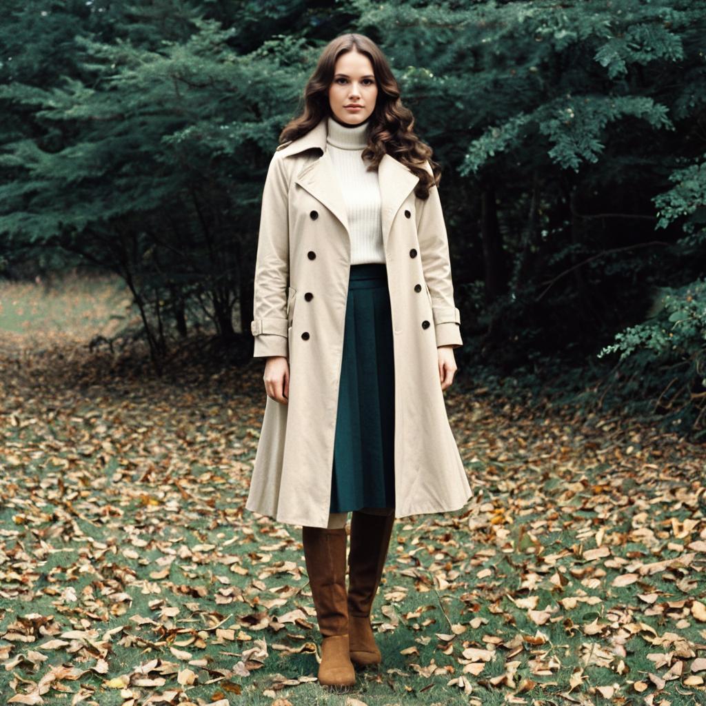 Full body shot of a woman wearing a 1970s style beige trench coat, high neck white blouse, dark green simple skirt, and brown knee-high boots. She has wavy brunette hair and stands confidently outdoors on a leafy ground with dense green forest in the background, embodying modest vintage elegance.