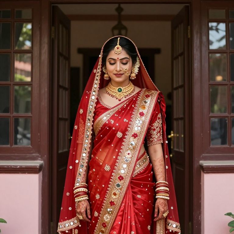 High-resolution realistic image of a Bengali traditional bride in a ceremonial red and gold bridal saree with floral border and mirror work, wearing a gold jhumka and a floral headpiece, standing at the entrance of a heritage house in Kolkata during a traditional wedding event, soft sunlight through the windows, her face lit with pride, eyes closed briefly in a moment of spiritual reflection.
