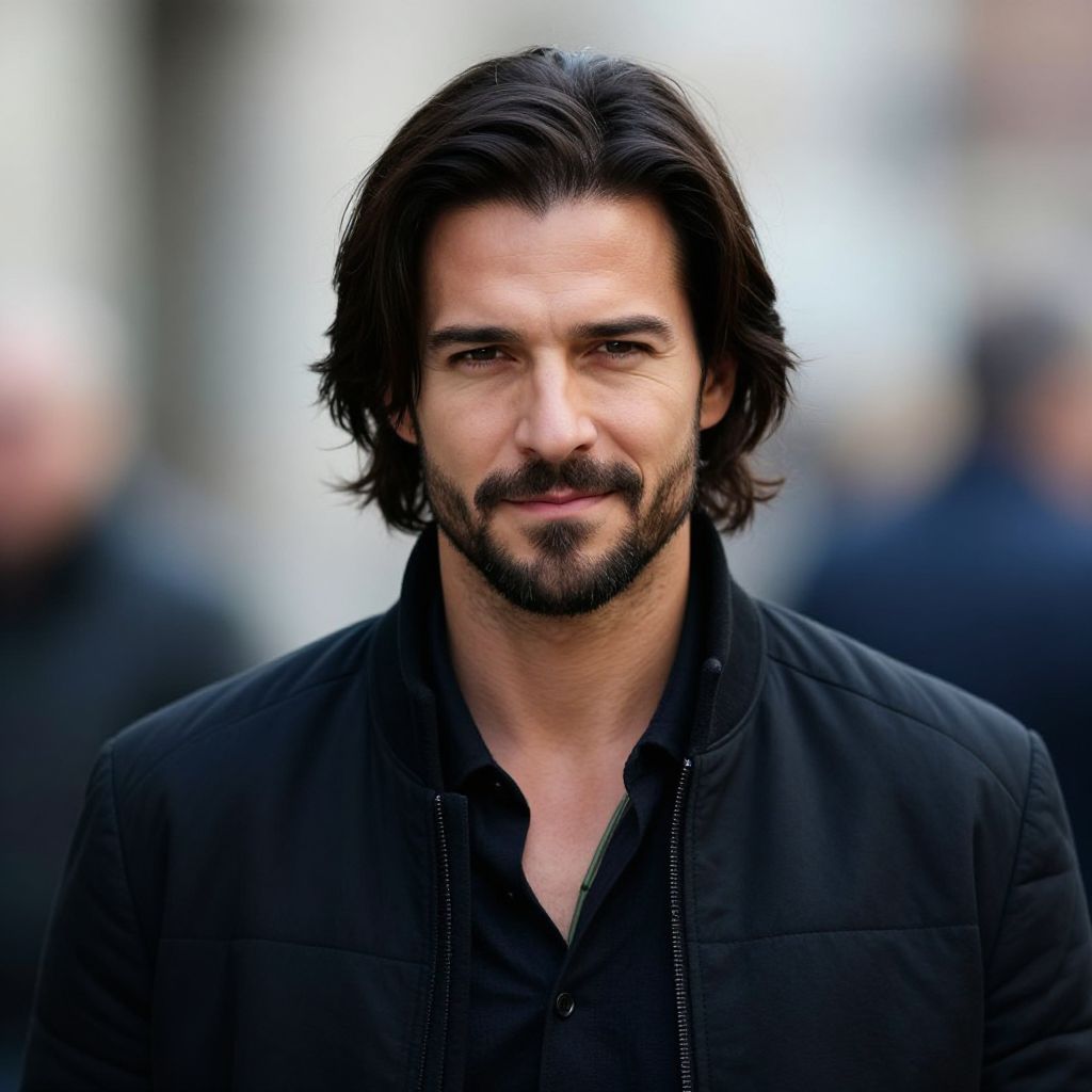 This is a photograph of a handsome man with medium-length, dark brown hair and a trimmed beard. He's wearing a black, quilted, shoulder-padded jacket over a dark shirt, with a subtle green necklace. His expression is confident and slightly smirky. The background is blurred, showing an outdoor urban setting with indistinct figures. The lighting is natural, highlighting his features.