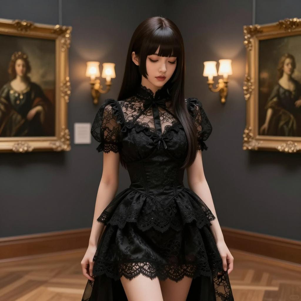 Ultra-detailed digital anime portrait of a dark-haired woman with straight bangs and long hair, wearing an elegant black lace and layered dress with puffed sleeves and train. She stands in a dimly lit, velvet-draped gallery featuring framed oil paintings and golden wall sconces. Soft backlighting creates a cinematic glow, highlighting realistic textures and reflections on her dress and hair. The serene subject looks downward with a calm expression, set against a muted dark-toned background with warm highlights, rendered in a photorealistic anime style.