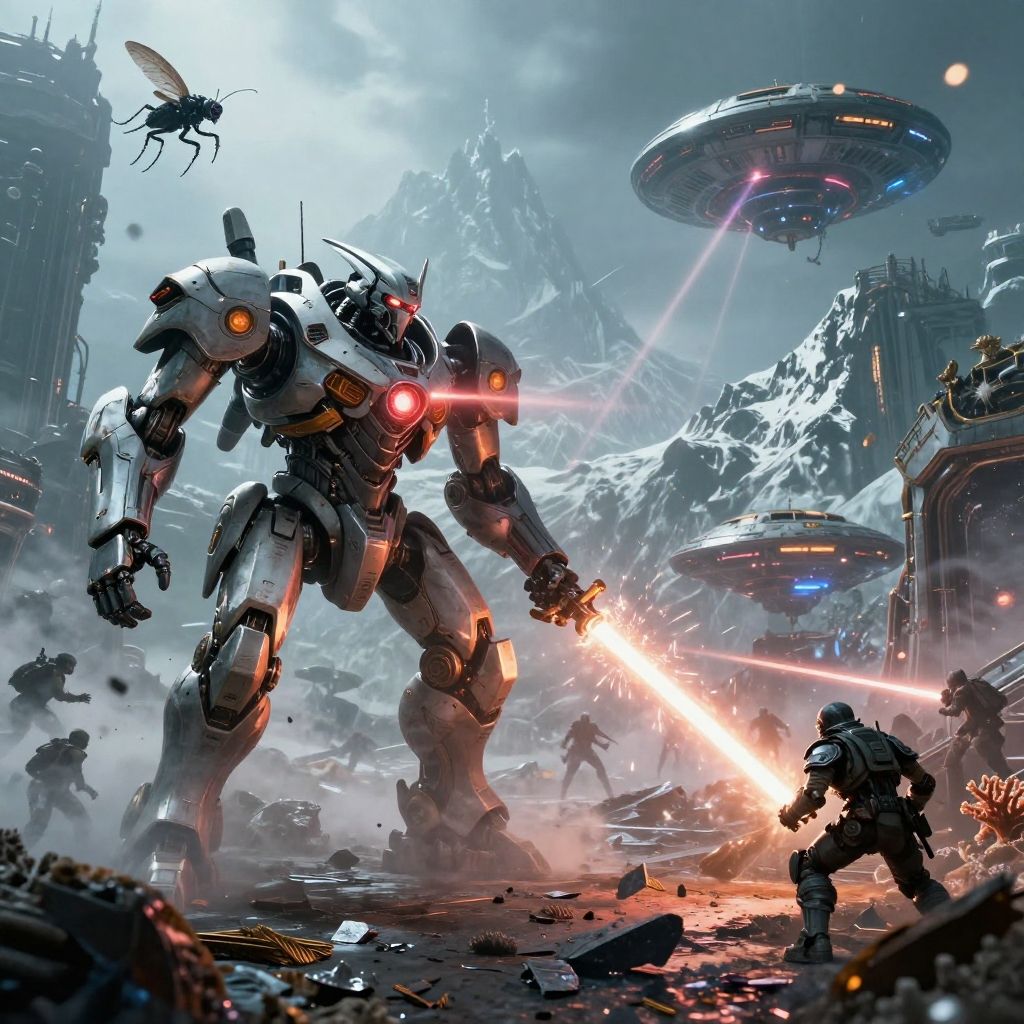 Epic sci-fi battle scene: massive white mecha with glowing red eyes and laser gun clashes with humanoid soldiers amidst flying saucers, snow-covered
