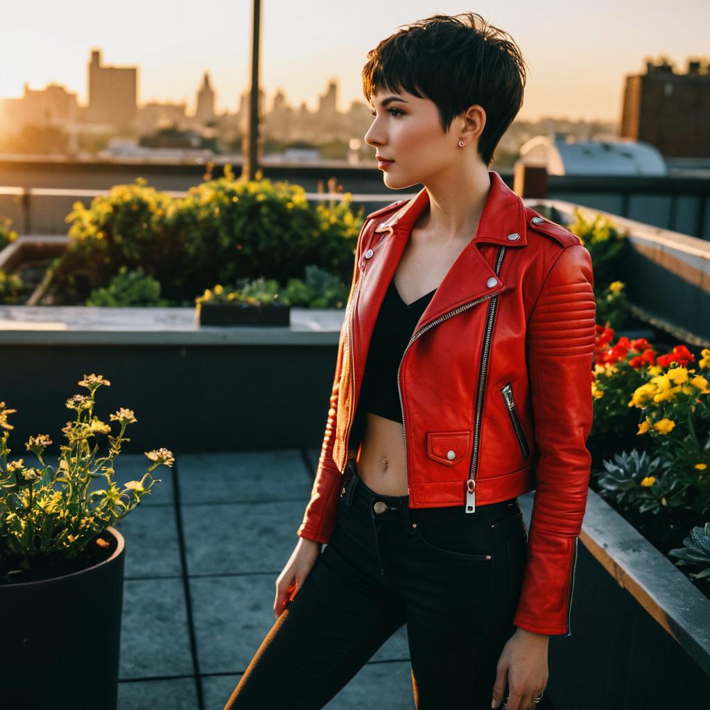 Textured pixie cut on a model wearing tailored navy blue pantsuit, set in modern rooftop terrace at sunset, captured in high-fashion editorial style with warm rim lighting, dramatic shadows, shallow depth of field, high-resolution detail, and subtle film grain.