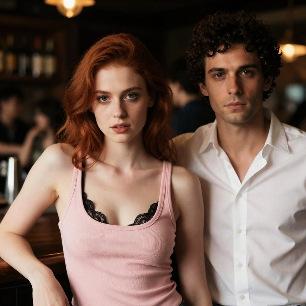 Photograph of a young woman with long blonde hair wearing black lace lingerie with pink accents and a necklace, standing next to a young man with curly brown hair, mustache, glasses, and a black skeleton print t-shirt. Both subjects are holding pillows while standing in a cozy living room featuring a window with curtains, a fish tank, and wooden furniture. The woman and man have neutral expressions.