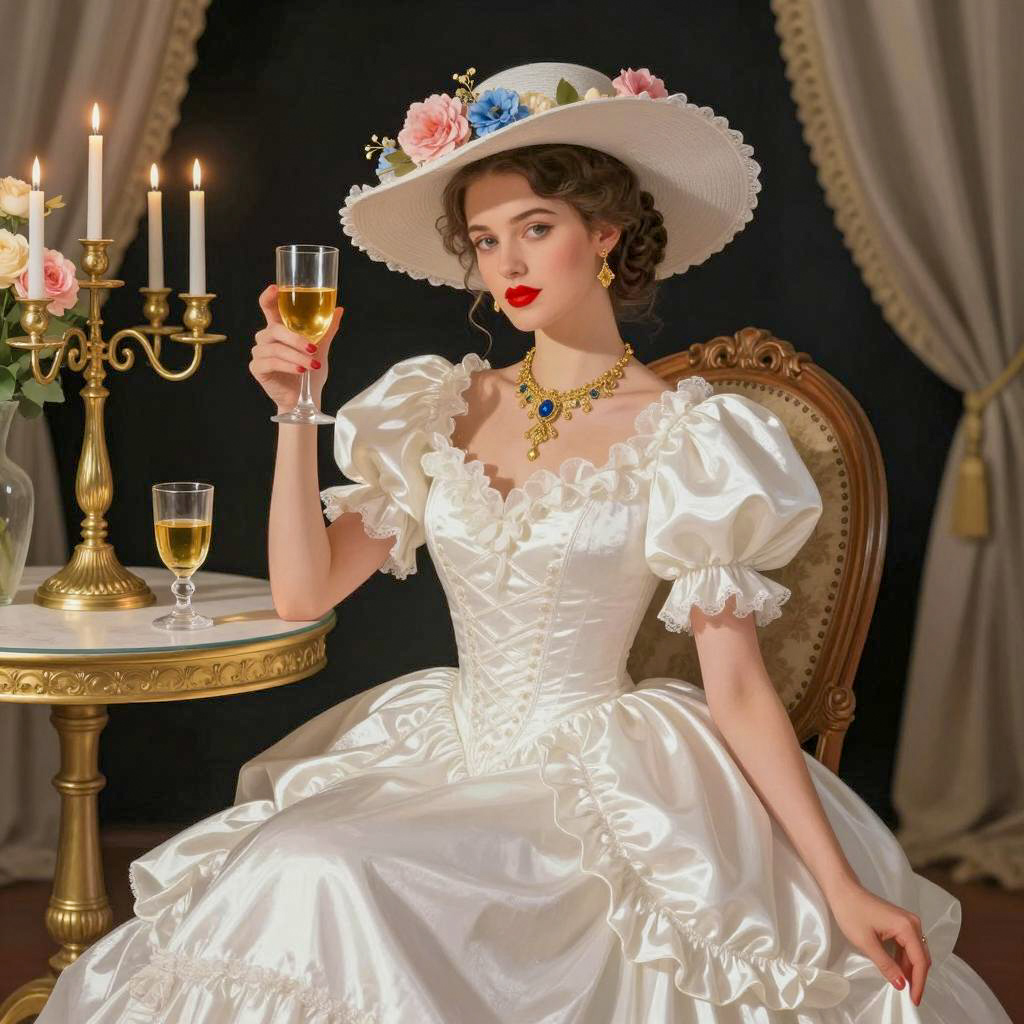 Illustration of a woman in an elaborate white ball gown with puffed sleeves, holding a glass of golden liquid. She has red lipstick, a large white hat with pink and blue flowers, and a detailed gold necklace. She sits on an ornate chair with a gold candelabrum and flowers on a table behind her. Another glass of golden liquid is on the table. Her right hand rests on her lap, left hand holding the glass. Her expression is confident. Dark curtains in the background.
