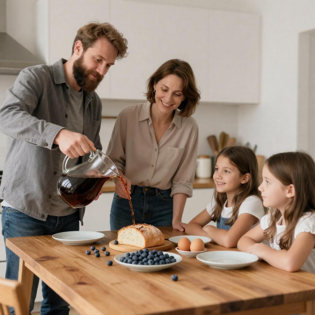 Photograph of a kitchen scene. Man with brown beard and grey jacket pours from a glass jug, middle-aged woman with short brown hair smiles, three young girls with brown hair sit at a wooden table. Table has blueberries, bread, eggs, plates. Background has white cabinets and kitchen items. Man stands left, woman center, girls right. Warm light, casual atmosphere.