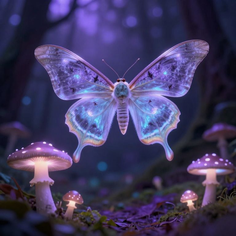Mystical sedacious moth with translucent wings hovering over glowing mushrooms in a twilight forest, surreal fantasy vibe, rich purples and blues, intricate wing patterns emitting a soft luminescent glow, high detail digital art