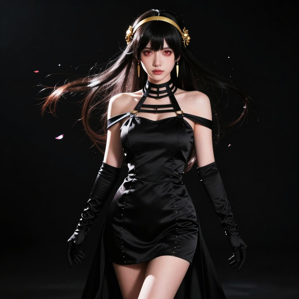 Yor briar, (photorealistic), beautiful girl, backlighting, bare shoulders, black background, black dress, black gloves, black hair, breasts, closed mouth, cowboy shot, dress, earrings, expressionless, fingerless gloves, floating hair, gloves, gold earrings, gold hairband, hair flower, hair ornament, ((hairband)), jewelry, large breasts, light particles, long hair, looking at viewer, off-shoulder dress, off shoulder, petals, red eyes, short hair with long locks, sidelocks, solo, spikes, thighs, two-sided dress, two-sided fabric
