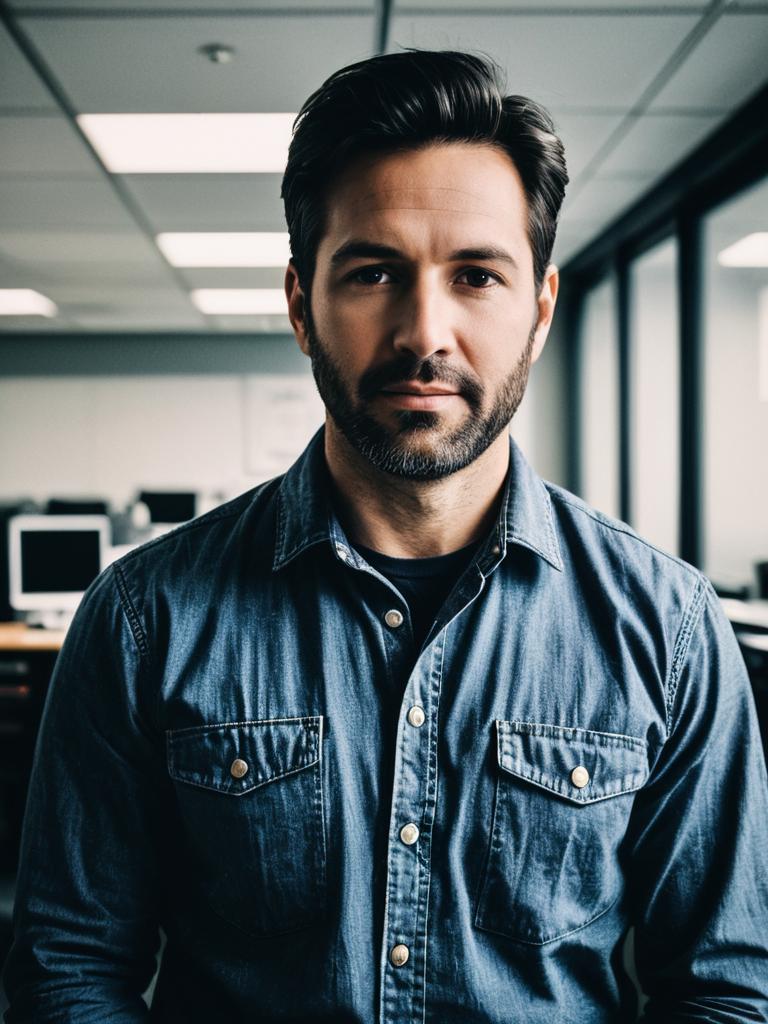 Man in Casual Office Outfit, photorealistic professional portrait, cinematic realism