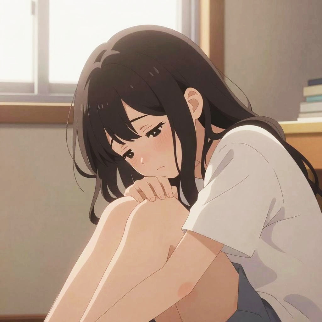 Tired eyes anime girl in cozy room, soft pastels, warm light from window, messy hair, slouched posture, emotional depth, delicate linework, soft shadows