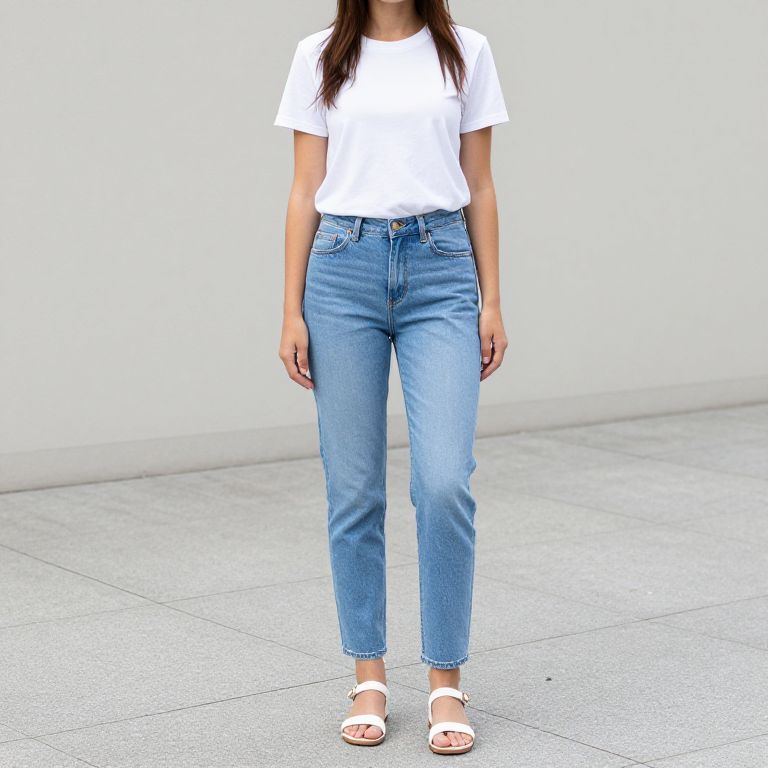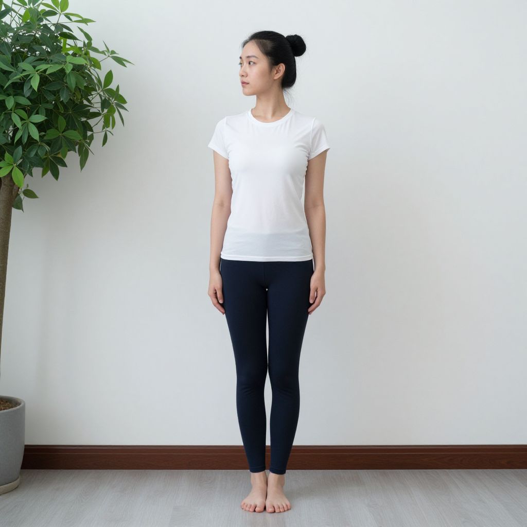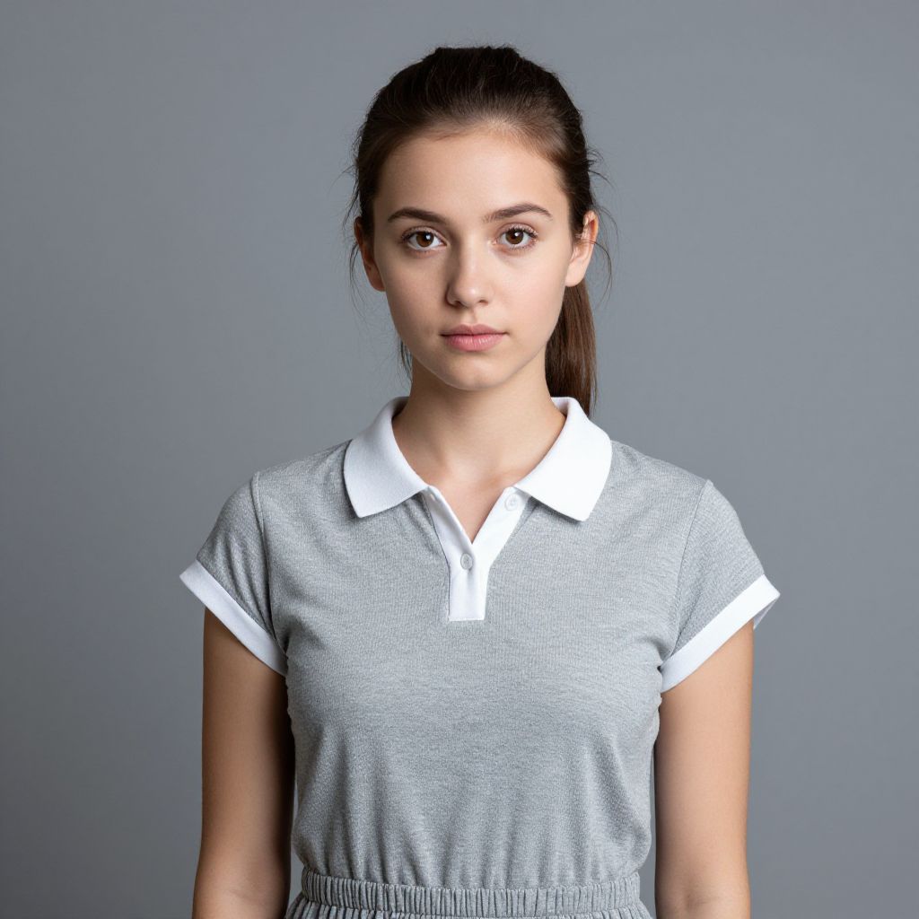 A photograph of a young woman with light olive skin and dark brown, wavy hair standing in a minimalistic room. She wears a short-sleeved, white crop top revealing her midriff and high-waisted, white shorts. Her feet are adorned with white sandals. She stands with her arms behind her back, looking directly at the camera with a neutral expression. The background features two potted palm plants placed symmetrically on either side of her against a plain, light gray wall. The floor is a smooth, light gray surface.