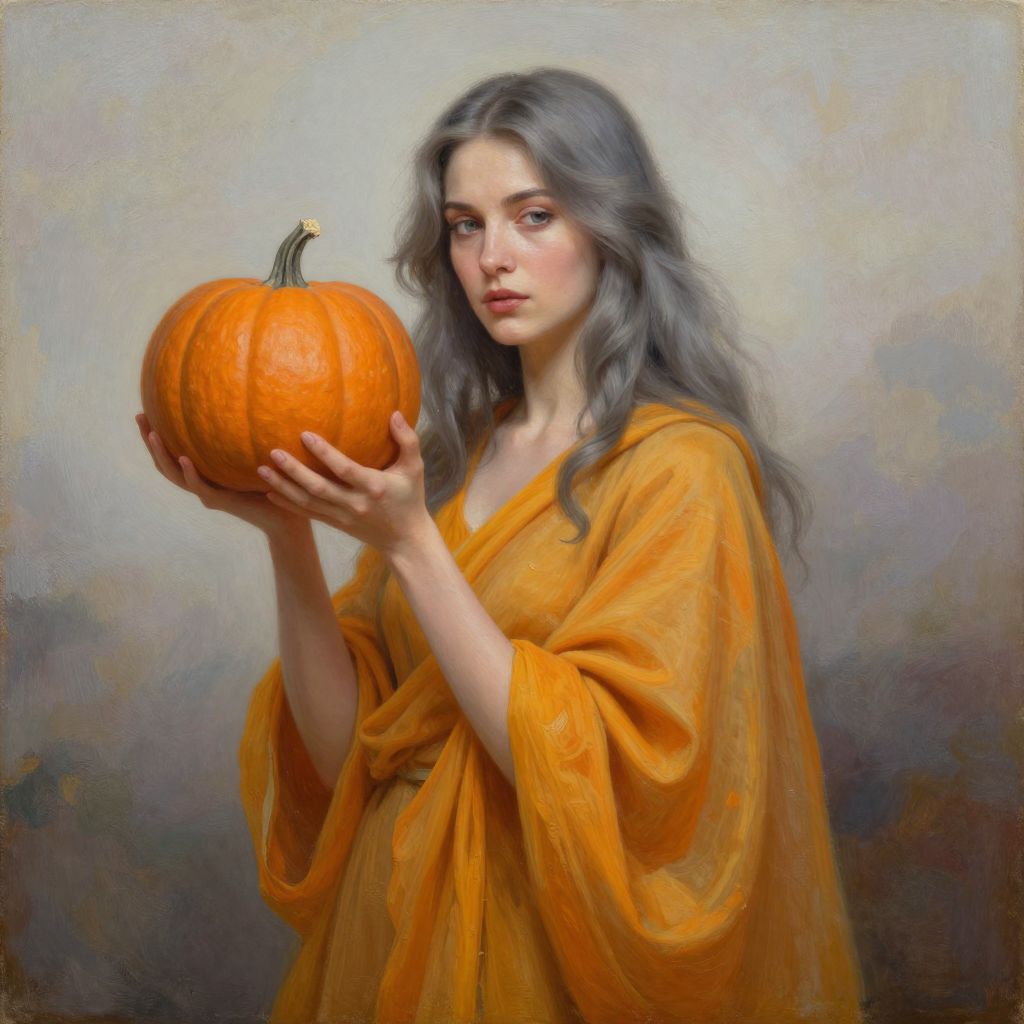 An ethereal, grey-haired woman in saffron robes holds a pumpkin, depicted in an oil painting.