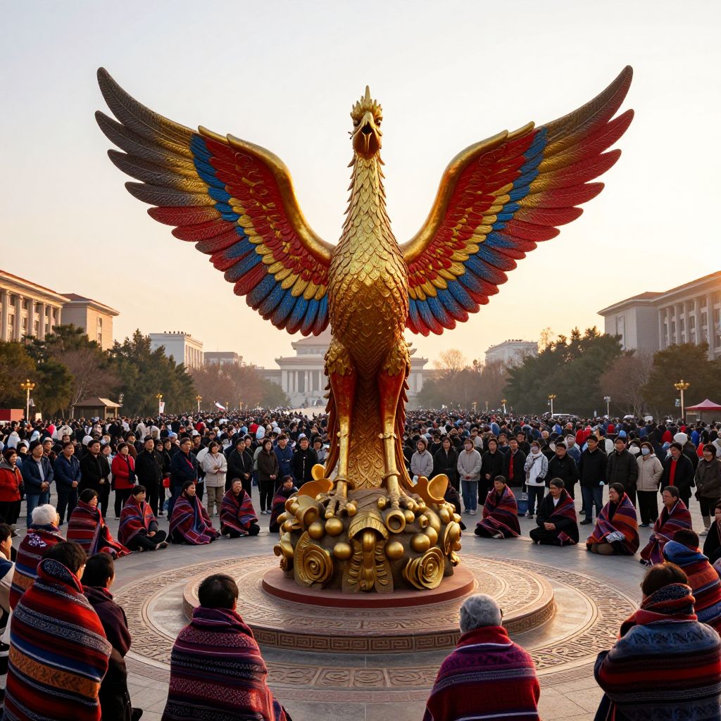 A colossal bronze phoenix sculpture with vibrant golden, red, and blue tones stands with wings spread on an ornate circular platform featuring intricate patterns. The scene captures a large crowd of people wrapped in colorful patterned blankets gathered around the sculpture in an outdoor plaza during golden hour, with warm sunlight illuminating the setting. The architectural background suggests a formal or historic urban location.