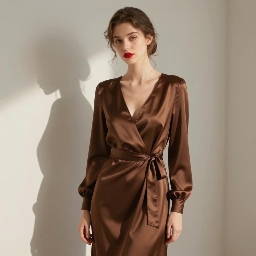 Ready made gown styles woman, photorealistic, portrait of young woman, brown hair in loose bun, wearing red lipstick, deep V-neck, long-sleeved, brown satin dress with belt, standing against light gray wall, soft sunlight, realistic shadows, natural light, elegant, modern style, casual pose, clear skin, minimal makeup, relaxed expression, fashion photography, detailed ures, high quality, realistic clothing folds, warm color palette, slight shadow on left side