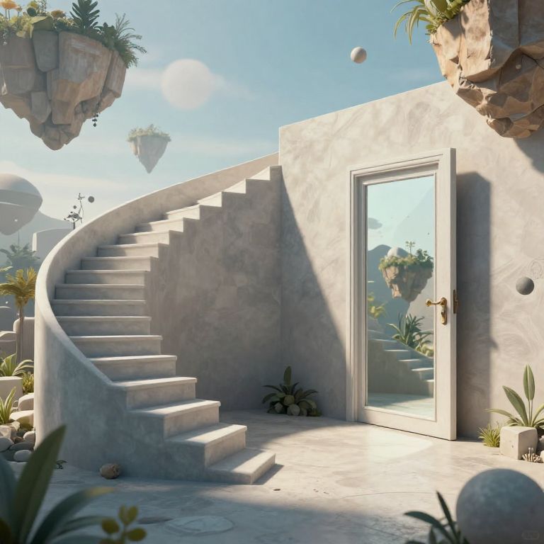 An impossible space filled with surreal elements like a staircase spiraling into the void, a door leading to a mirror reflecting a different dimension, and a sky filled with floating islands and impossible geometries.
