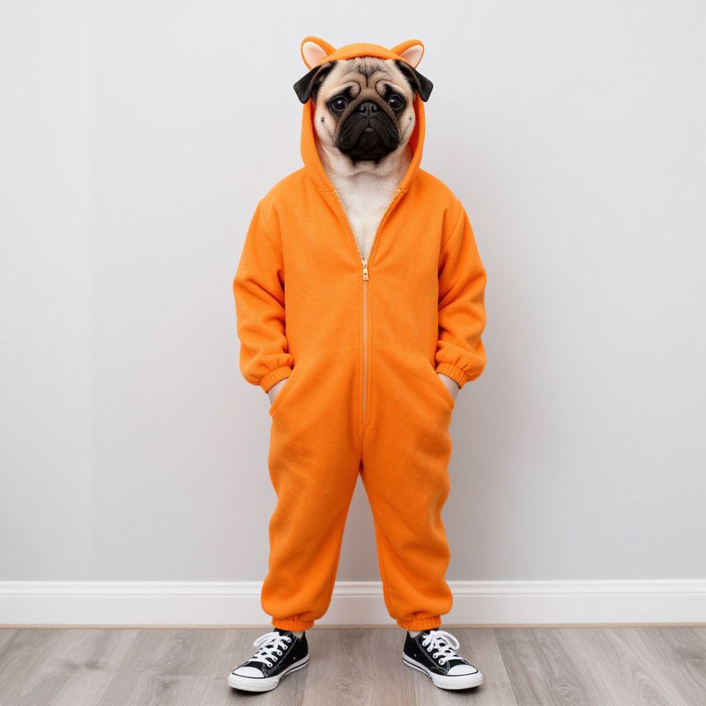 "funny costume pugs, solo, cosplay, kigurumi, looking at viewer, 1boy, hands in pockets, full body, shoes, male focus, standing, sneakers, orange jumpsuit, animal costume Realistic photo of casual sexy person with pretty face"