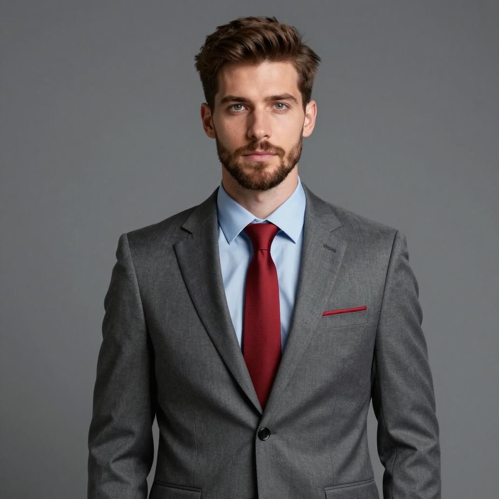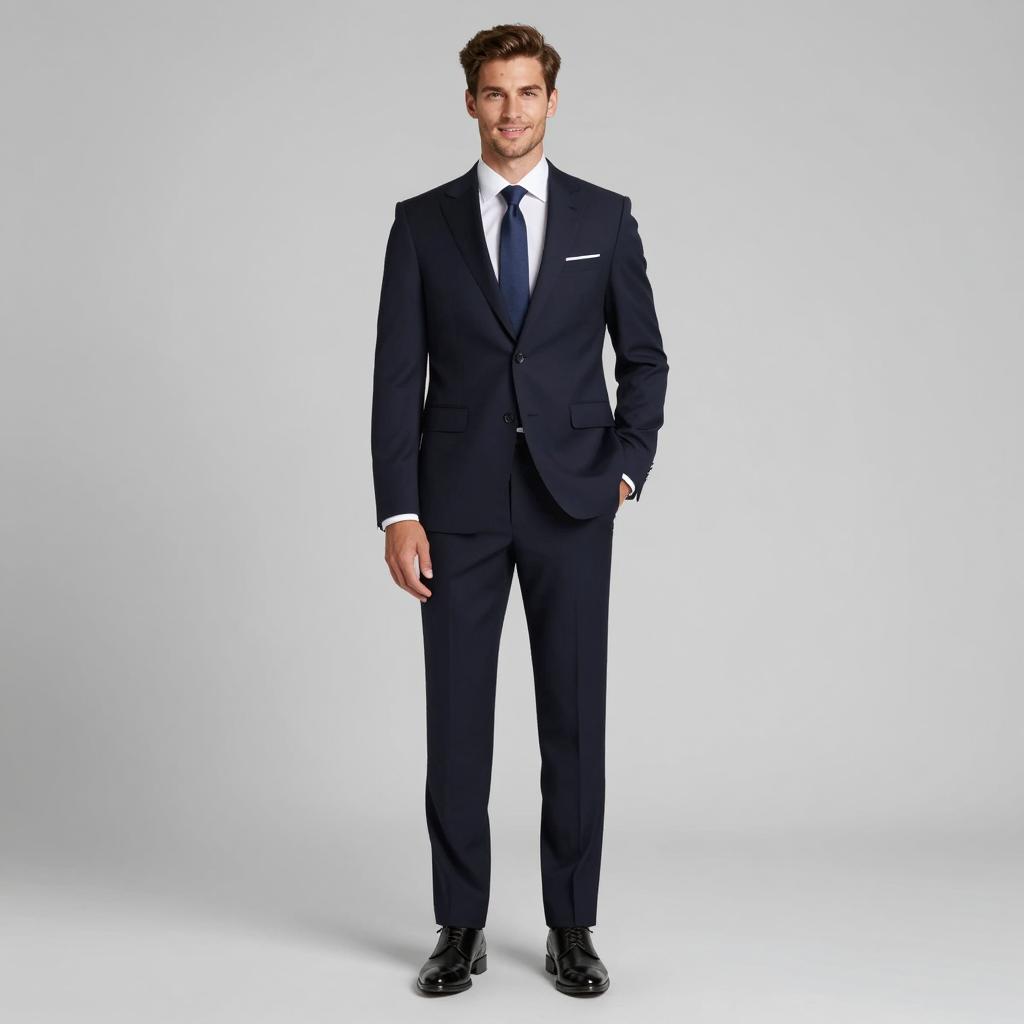 Stag party suit, photorealistic portrait of a handsome man, medium build, short dark brown hair, well-groomed beard, serious expression, wearing a dark navy suit with a white dress shirt, black tie, and a white pocket square, standing against a plain light grey background, studio lighting, no accessories, sharp focus, realistic ures, modern fashion style, head and torso shot, front view, slightly angled to the left