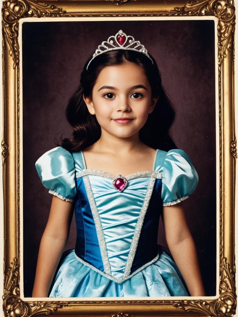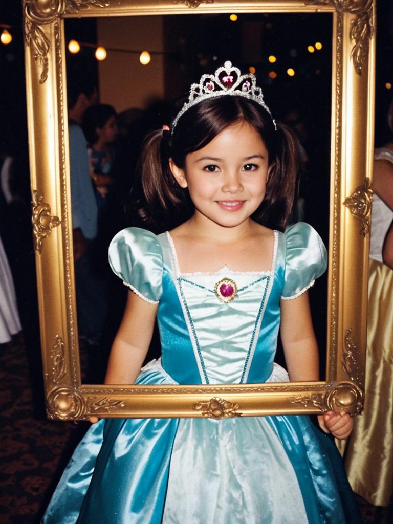 Portrait of a smiling young girl dressed in a blue satin princess dress with puffed sleeves and a jeweled heart brooch, wearing a silver tiara with colorful gems. She is holding a large ornate golden picture frame, standing at a costume party with a blurred background of partygoers and warm lighting.