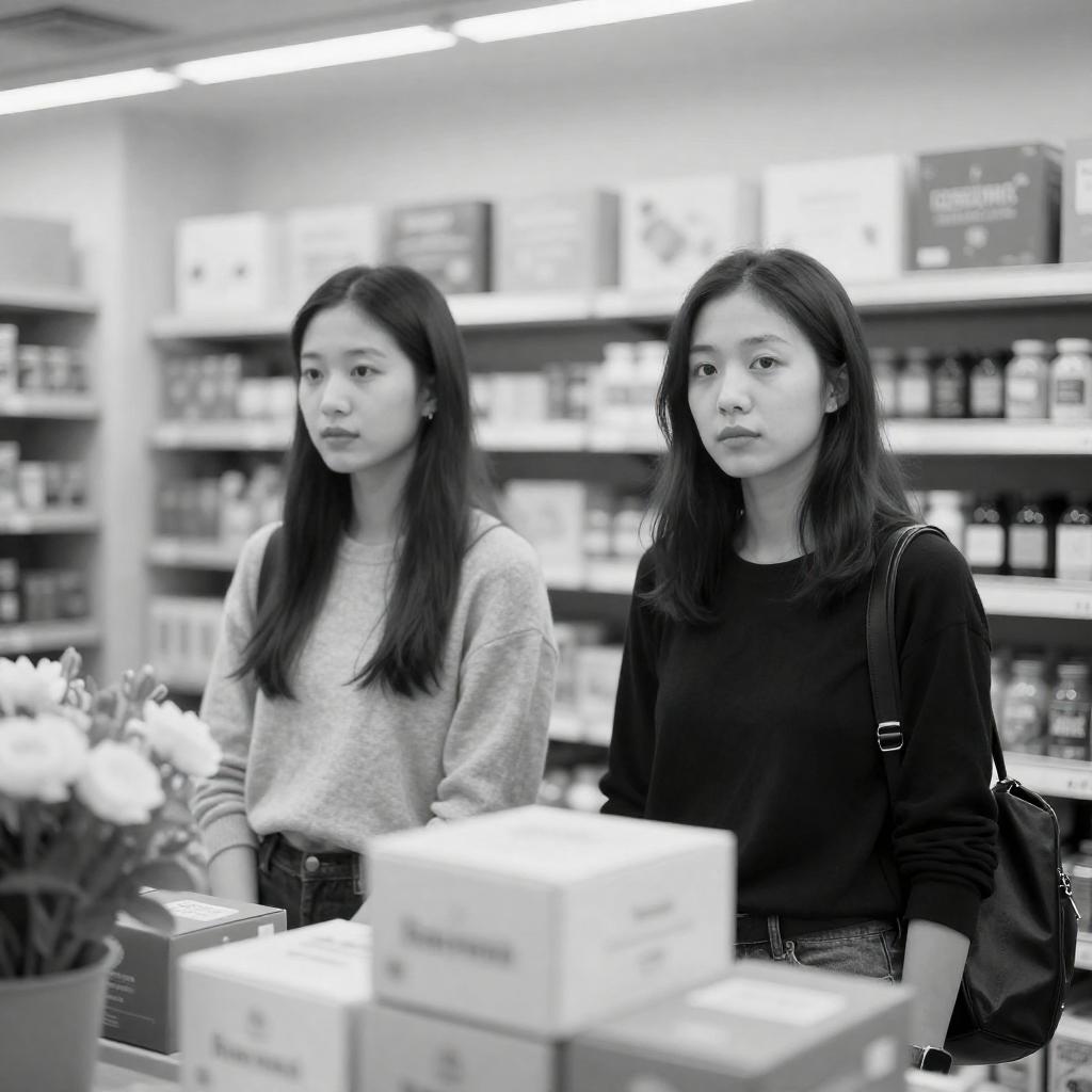 Black-and-white photograph of two women standing in a brightly lit store. The woman on the left has long dark hair, wears a gray sweater, and looks to the side. The woman on the right has shoulder-length dark hair, wears a black top, and looks at the camera. They are surrounded by stacked boxes and flowers in the foreground.