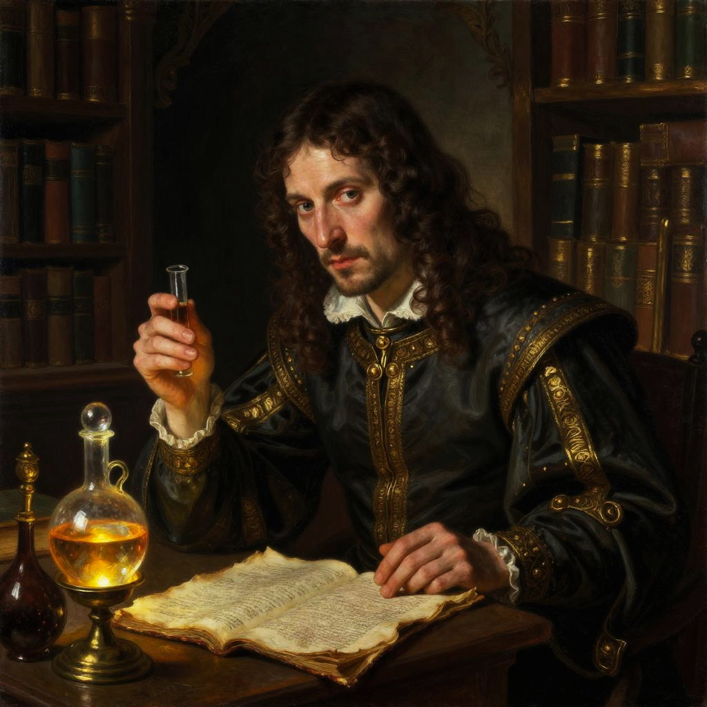 Raphaƫl Ambrosius Costeau, a mysterious Renaissance alchemist in a dimly lit ancient library, surrounded by old manuscripts and glowing potions, intricate attire with gold embellishments, moody chiaroscuro lighting, detailed expressive face, oil painting style.