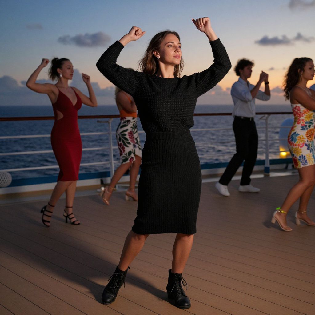 A woman in a black textured sweater tucked into a ribbed midi skirt, paired with black lace-up ankle boots, is gracefully dancing during an evening class on a cruise ship deck. The scene is captured in a cinematic style, highlighting the vibrant atmosphere of the ocean backdrop as the sun sets. Sexy. Pretty face and beаutiful eyes. Big breasts