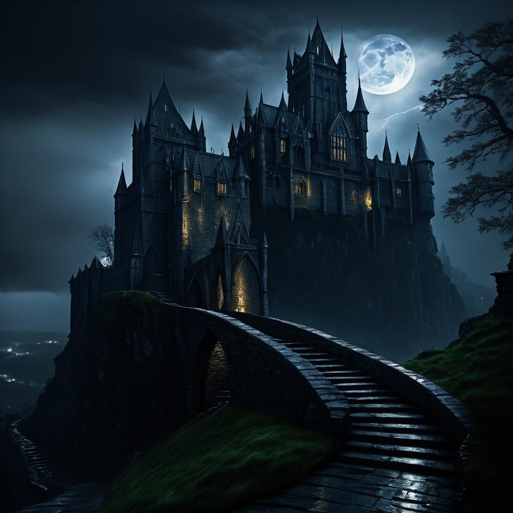 Elven castle on a hill, at night, eerie atmosphere, raining, detailed gothic architecture, ominous bridge, moody and atmospheric lighting, high quality, realistic, dark and gloomy, stormy weather, medieval fantasy, detailed stone textures, dramatic shadows, foreboding setting, ominous atmosphere, detailed rain effects, gothic, sinister, atmospheric lighting
