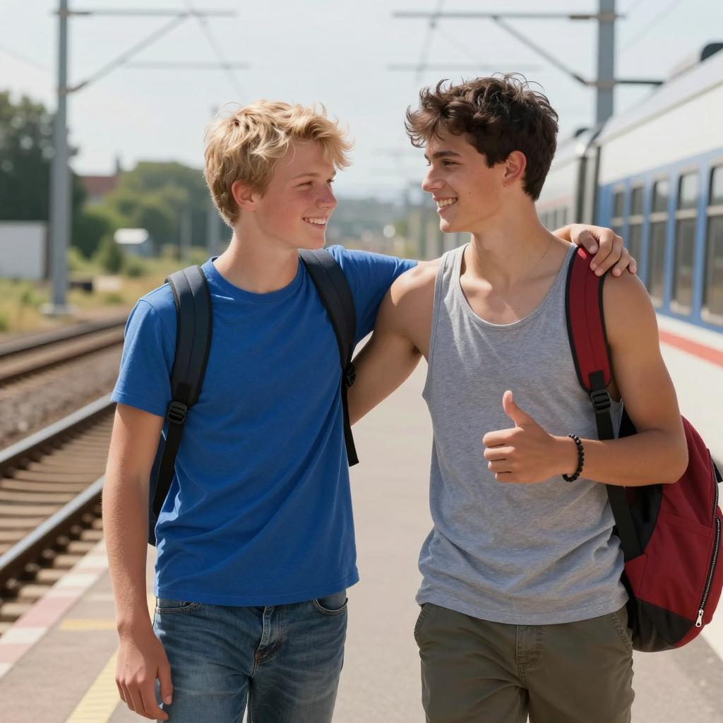 Two teenage boys standing on a train platform. The blond boy in a blue shirt leans towards the dark-haired boy in a gray tank top with a thumbs-up graphic. The dark-haired boy has a red shoulder bag and smiles, placing his arm around the blond boy's shoulder. Both are smiling. Train tracks and overhead wires extend into the background. Sunlight illuminates the scene.