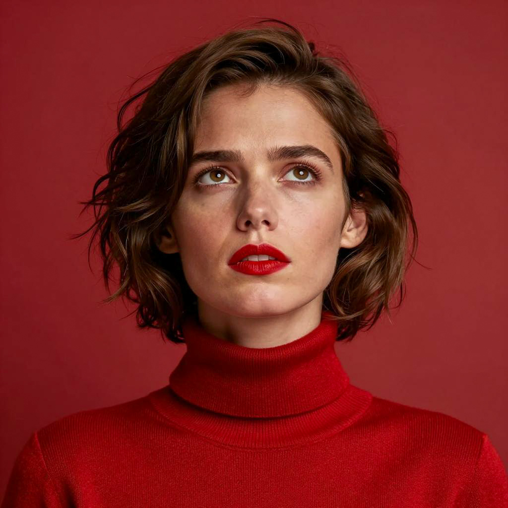 Close-up portrait of a woman with light brown highlighted hair and bangs, blue eyes, and purple lipstick. She is wearing a black lace top and white earrings. The background is neutral and blurred, focusing attention on her face and upper body. The woman has a neutral expression and is looking directly at the camera.