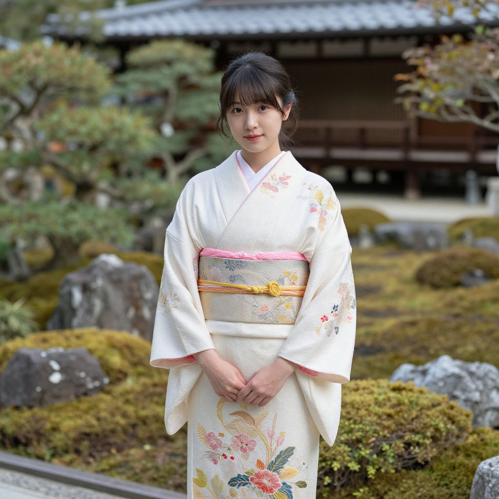 A young woman dressed in an elegant traditional Japanese kimono with detailed floral embroidery poses in a serene Japanese garden setting. The background features classic architecture and manicured greenery, highlighting the harmony of culture and nature in this realistic portrait.