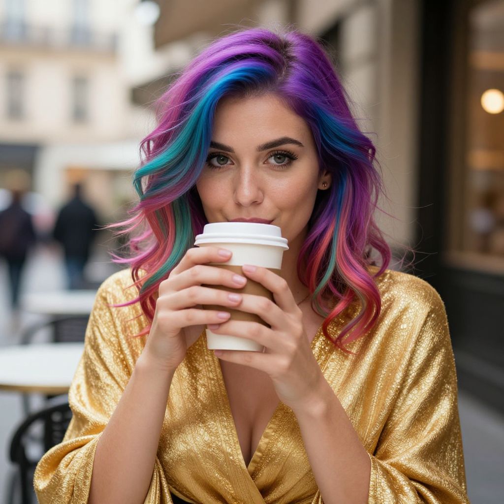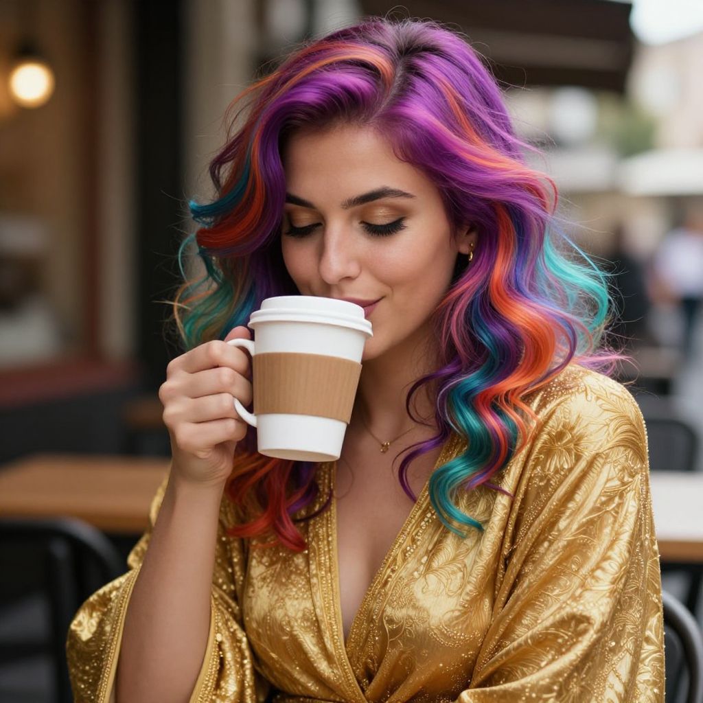 Radiant joy and vibrant energy intertwine as a woman with kaleidoscopic hair, wrapped in a golden embrace, sips warmth from her coffee, embodying the fleeting yet eternal dance of color and connection.