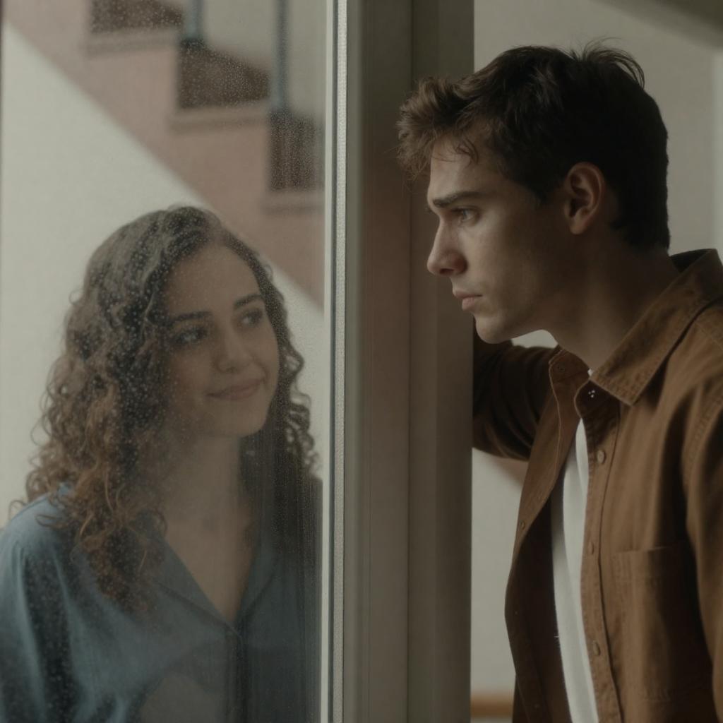Portrait of a young man with short brown hair wearing a brown shirt and white undershirt, leaning against a door looking concerned. A woman with curly hair wearing a blue blouse is seen smiling subtly through a rain-speckled window, reflecting warm indoor light with a stair railing blurred in the background.