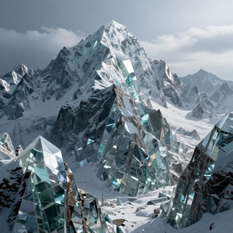Mountains made of glass reflect alternate realities, their crystalline peaks trapping time loops, dreamscapes, and forgotten memories.