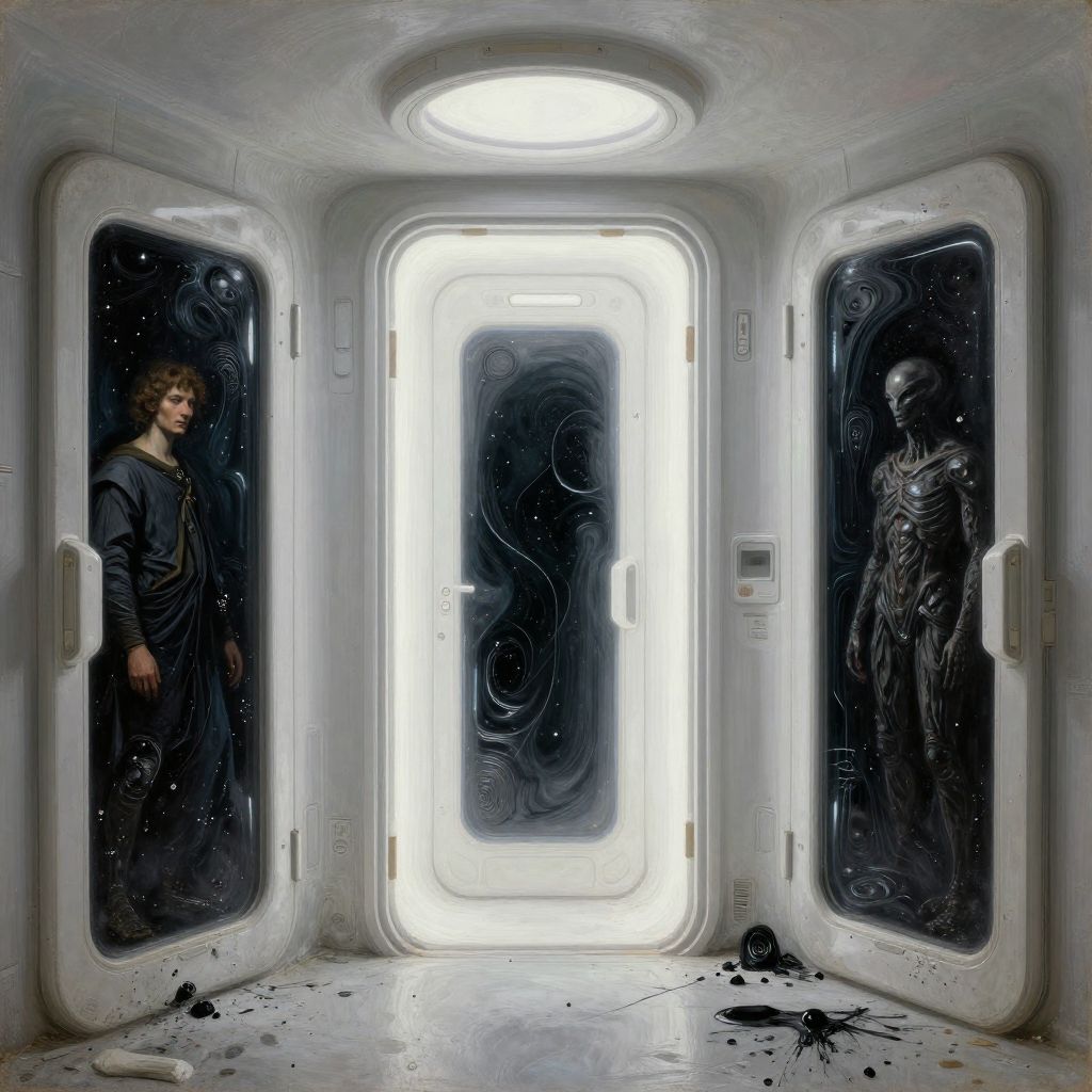 Darkest space cabin, messy, laconic, doors, alien, cosmic, otherworldly, mysterious, sci-fi, White glow, Futuristic tech concept, Perfect composition, Beautifully detailed intricate insanely detailed octane rendering on artstation, 8 k artistic photography, Photorealistic concept art, Soft natural volumetric cinematic perfect light, chiaroscuro, award winning photography, masterpiece, oil on canvas, Raphael, Caravaggio, Greg Rutkowski, Beeple, Beksinski, Giger, neon ambience, abstract black oil, rendered in Unreal Engine, photorealistic, bright softbox lights