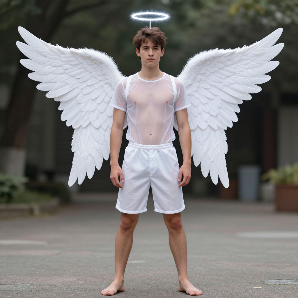 Photograph of a young man with white angel wings, halo, sheer white shirt, and shorts, standing barefoot on a paved path.
