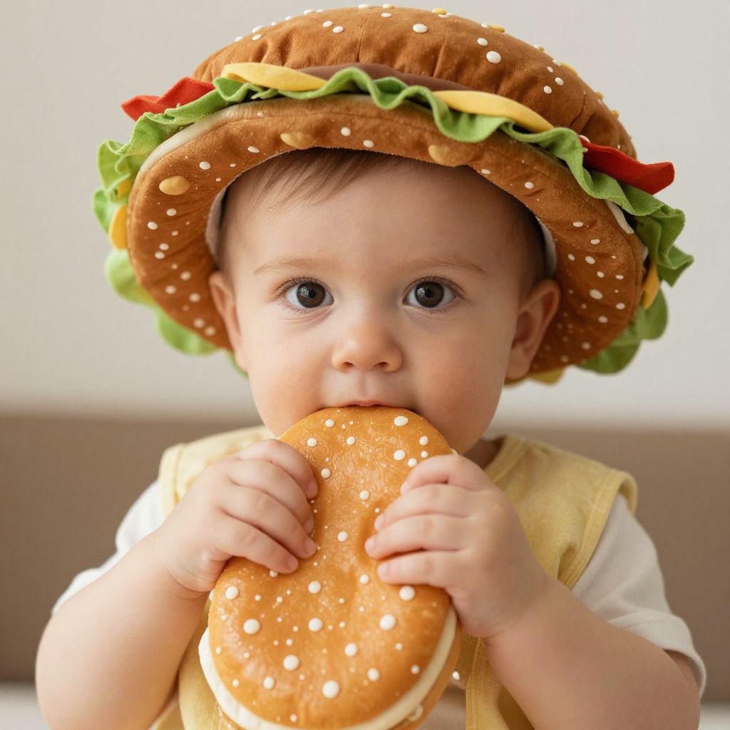 Photograph of a baby with a hamburger hat, biting into a sesame seed bun, wearing a yellow vest, with a blurred beige background.