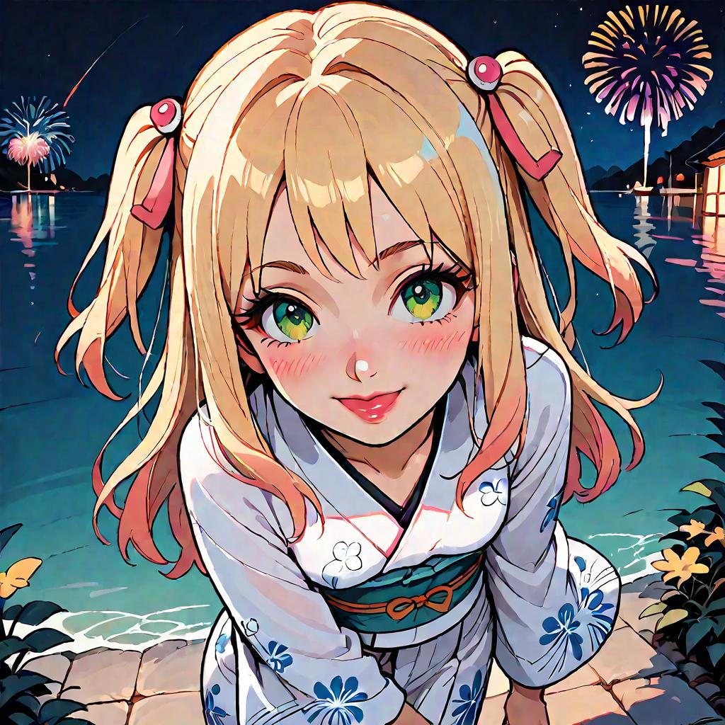 Illustration of a petite anime girl with long blonde hair styled in two ponytails, wearing a white floral print yukata and obi. She has green eyes, blush on her cheeks, and is smiling while looking up at the viewer. The background shows a night scene by a lake with colorful fireworks and traditional Japanese surroundings.