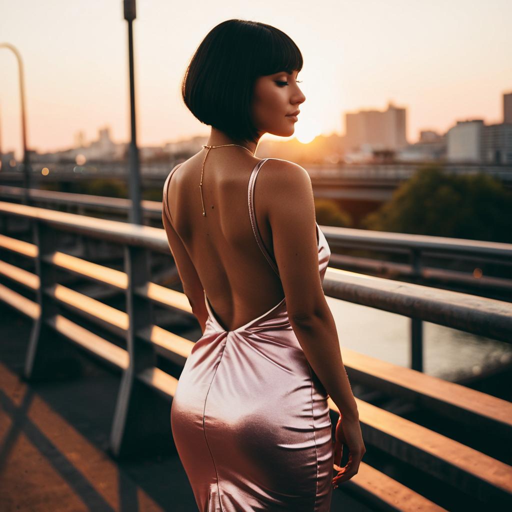 Fashion portrait of olive-skinned woman with sleek dark bob and dramatic eyeliner in a backless fitted dress, massive tits, standing on an urban bridge at golden hour, body turned away from the camera while looking back over her shoulder, soft warm sunset light, shallow depth of field, cinematic mood, dress in soft blush pink with subtle shimmer, subtle jewelry, glossy editorial photography