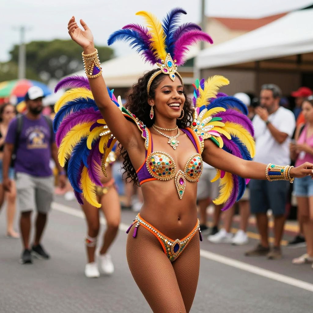 A vibrant scene featuring a woman in a stunning carnival costume, adorned with colorful feathers and sequins. She joyfully dances down a lively street, captivating the spirit of celebration and festivity, reminiscent of a carnival atmosphere.