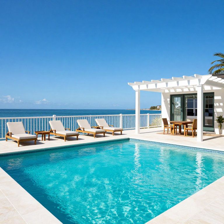 Bayside Estate showcases a serene paradise with a crystal-clear turquoise pool surrounded by four plush lounge chairs, a white pergola with wooden furniture, and a pristine white railing overlooking tranquil waters under a vibrant blue sky.