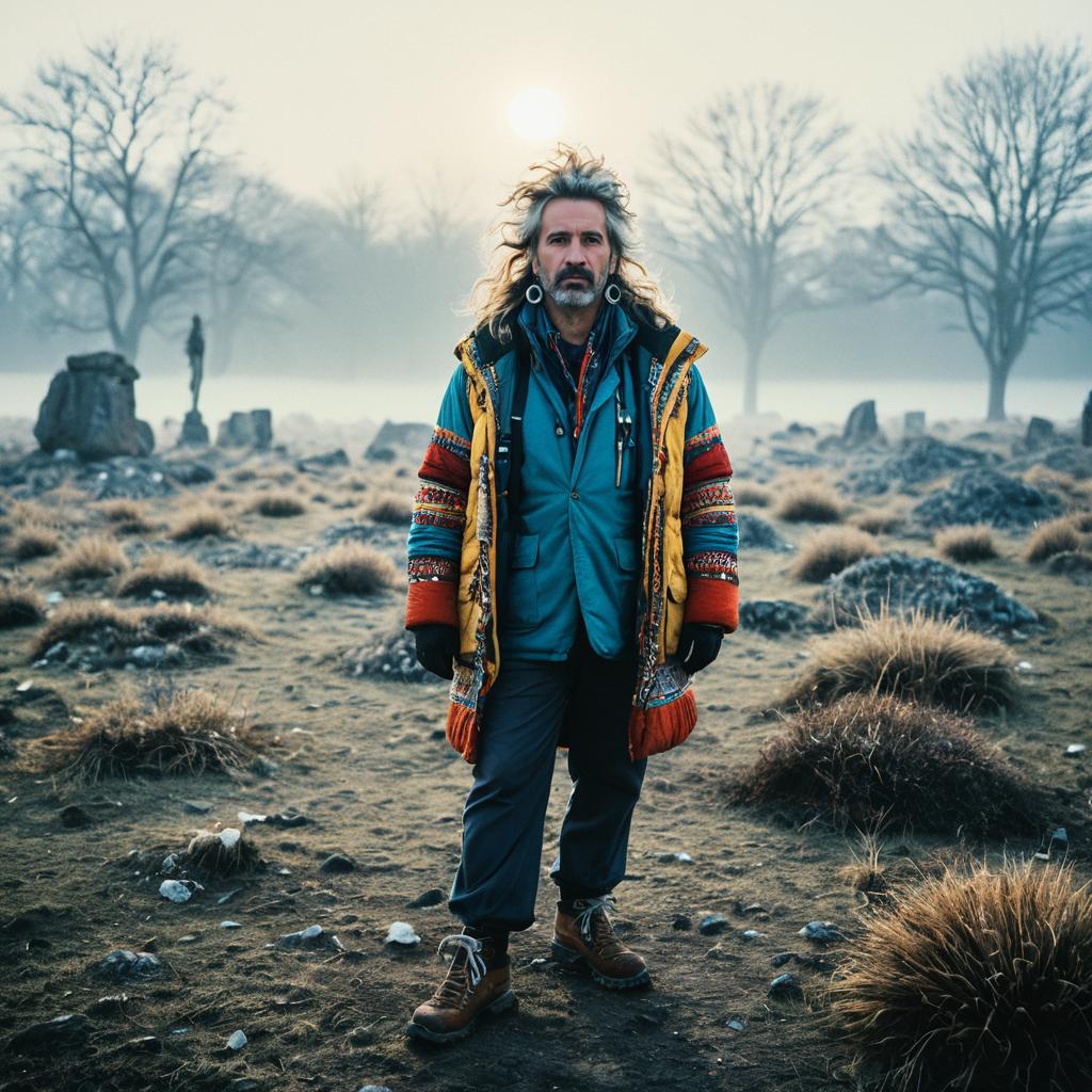 Full-body portrait of a 37-year-old male archaeologist standing outdoors in a foggy, rocky landscape during winter dawn. He has messy sun-bleached hair, large hoop earrings, and is dressed in vibrant, intricate layered clothing including a colorful patterned jacket, blue inner jacket, and hiking boots. The background features leafless trees and stones scattered on dry ground, with cool light and atmospheric fog enhancing the hyper-realistic, detailed setting.