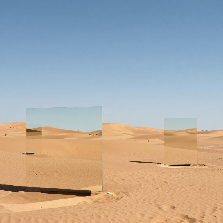 A desert of floating mirrors reflects impossible reflections—each showing an alternate life the viewer might have lived instead.