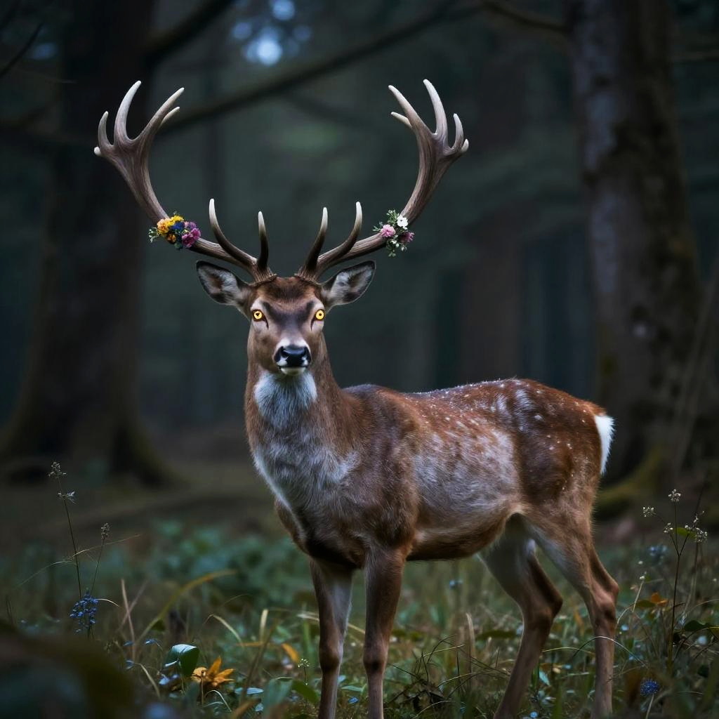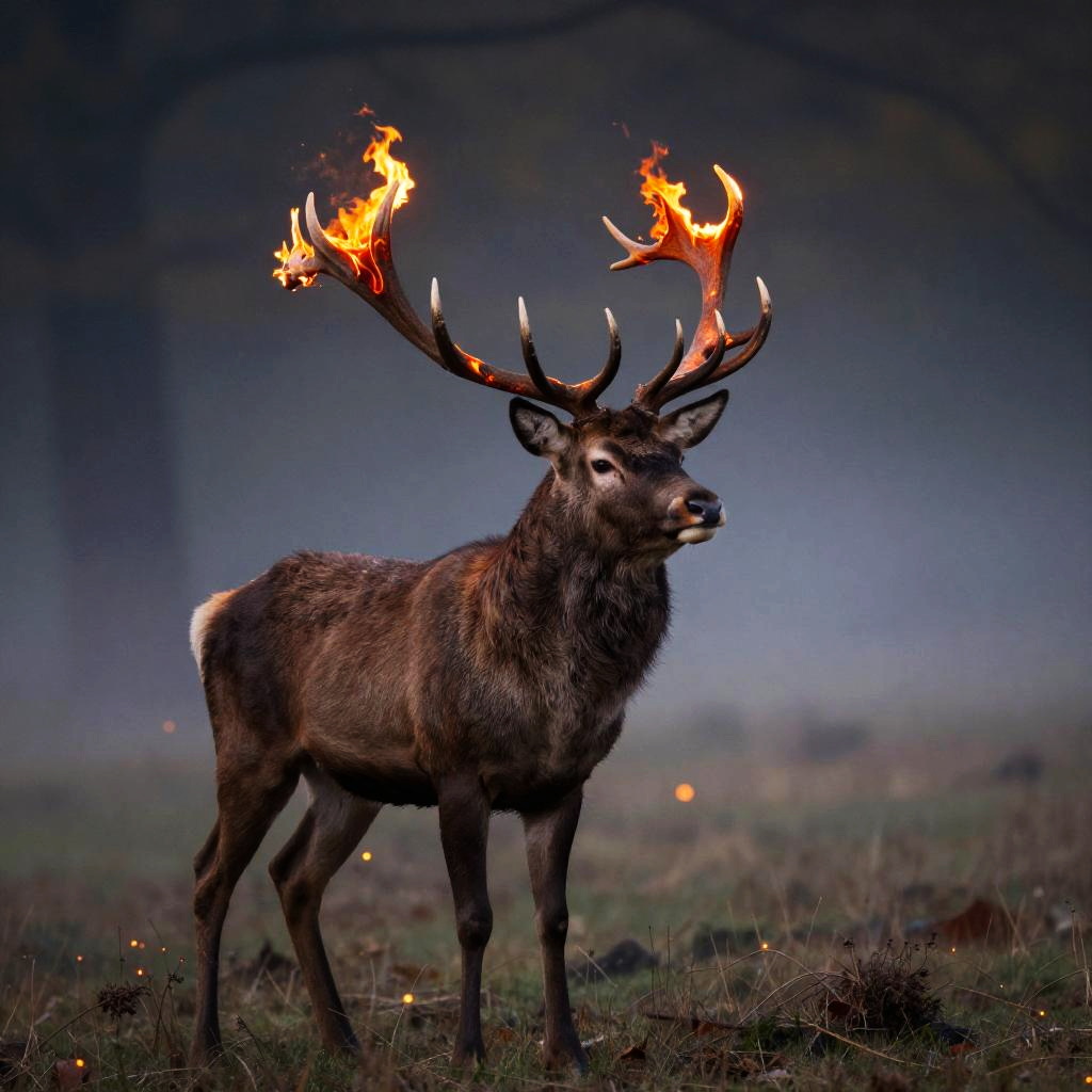 Fiery Horned Stag in Enchanted Forest