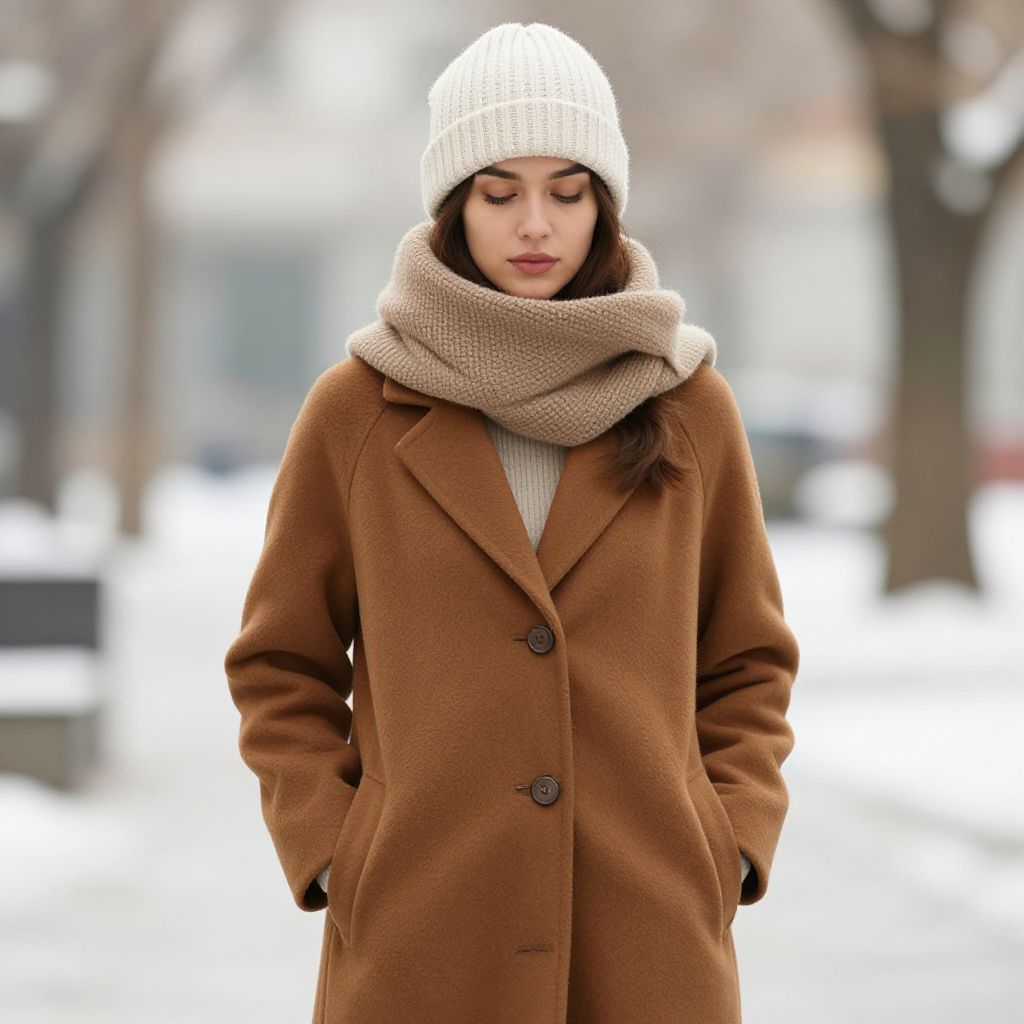 "Warm Clothes Winter Costume, woman in a brown coat and a hat and scarf"